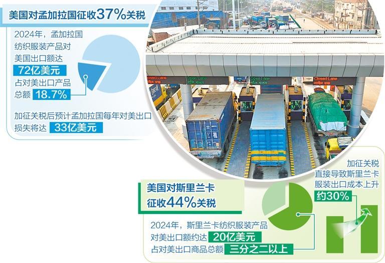 孟加拉國經(jīng)濟(jì)高度依賴紡織服裝產(chǎn)品出口,美國是孟加拉國除歐盟外的第二大出口市場(chǎng)。作為全球第二大服裝產(chǎn)品出口國,2024年,孟加拉國紡織服裝產(chǎn)品對(duì)美國出口額達(dá)到72億美元,占對(duì)美出口產(chǎn)品總額的18.7%。美國所謂“對(duì)等關(guān)稅”生效后,直接沖擊孟加拉國紡織服裝出口領(lǐng)域,使出口成本大幅增加,嚴(yán)重削弱了孟加拉國產(chǎn)品的價(jià)格競(jìng)爭(zhēng)力。在此背景下,預(yù)計(jì)孟加拉國每年對(duì)美出口損失將達(dá)到33億美元。此外,近期印度政府宣布不再允許孟加拉國經(jīng)印度陸地海關(guān)對(duì)第三國出口貨物,此舉將在短期內(nèi)進(jìn)一步推高孟加拉國貨物出口成本。