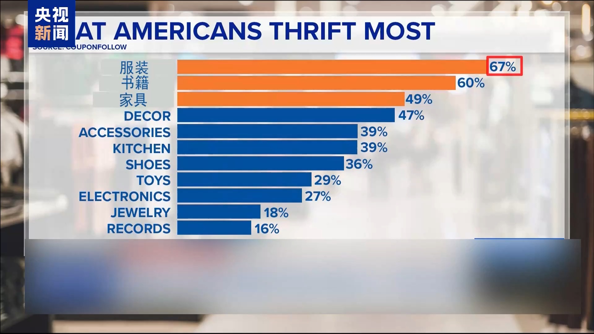 美國(guó)一家在線交易平臺(tái)(CouponFollow)的一組調(diào)查數(shù)據(jù)顯示,67%的美國(guó)消費(fèi)者選擇在二手市場(chǎng)購(gòu)買服裝,60%的人購(gòu)買書籍,近50%的人購(gòu)買家具。