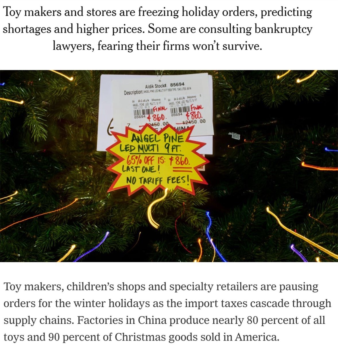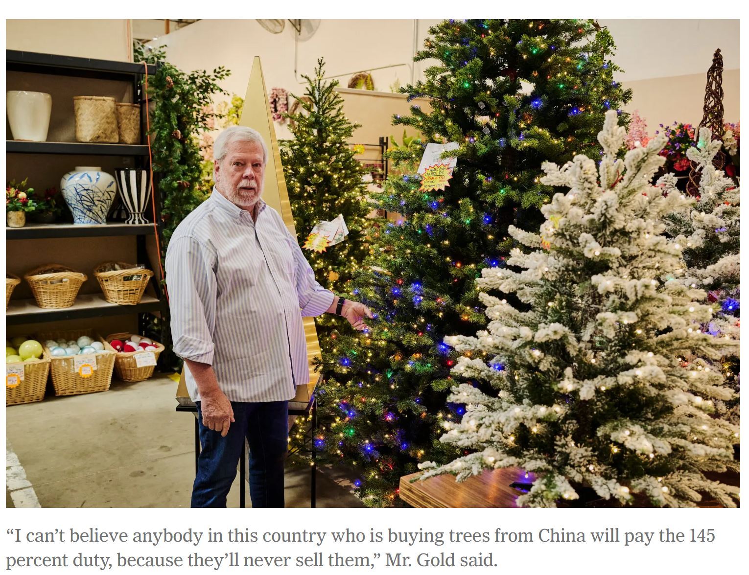 經(jīng)營(yíng)家居用品的拉里·戈?duì)柕抡f(shuō),去年一棵約2.3米高的圣誕樹在店里的價(jià)格大約是1000美元。如今他別無(wú)選擇,只能把關(guān)稅成本轉(zhuǎn)嫁給消費(fèi)者,這將使同樣的一棵樹今年的價(jià)格超過(guò)2000美元。他無(wú)奈地表示,這個(gè)價(jià)格等于“給產(chǎn)品判了死刑”。