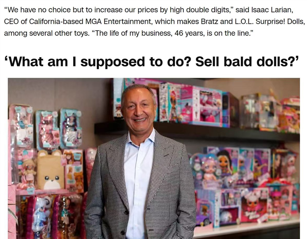 另一家美國(guó)玩具制造商的首席執(zhí)行官杰伊·福爾曼表示,公司的整個(gè)供應(yīng)鏈都在中國(guó)。他警告說(shuō),關(guān)稅不僅威脅到了玩具的價(jià)格和供應(yīng)量,甚至可能摧毀整個(gè)行業(yè)的生存根基。轉(zhuǎn)變經(jīng)營(yíng)策略,像變法術(shù)一般,創(chuàng)造出當(dāng)前還不存在的制造業(yè),談何容易。