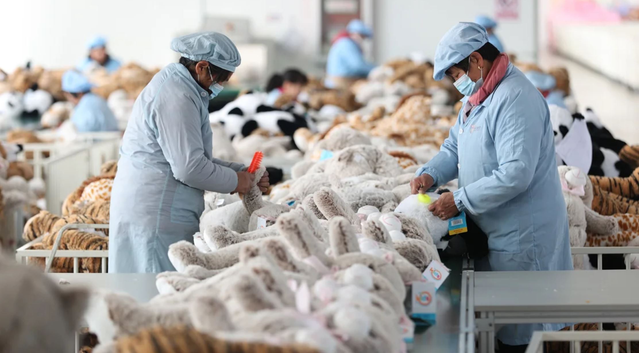 △中國(guó)連云港一家玩具制造廠的工人在準(zhǔn)備出口到其他國(guó)家的毛絨玩具。(圖自美國(guó)有線電視新聞網(wǎng)相關(guān)報(bào)道)