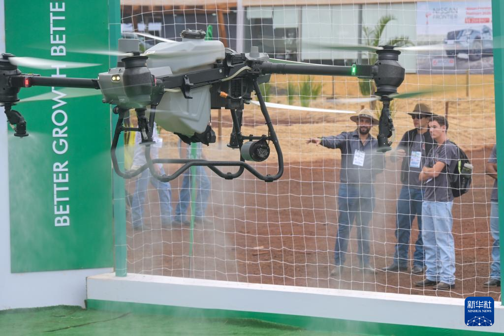 4月29日,在巴西圣保羅州里貝朗普雷圖市舉行的2025年巴西農(nóng)業(yè)科技展上,參觀者觀看大疆農(nóng)業(yè)無人機(jī)的噴灑演示。新華社記者 陳昊佺 攝