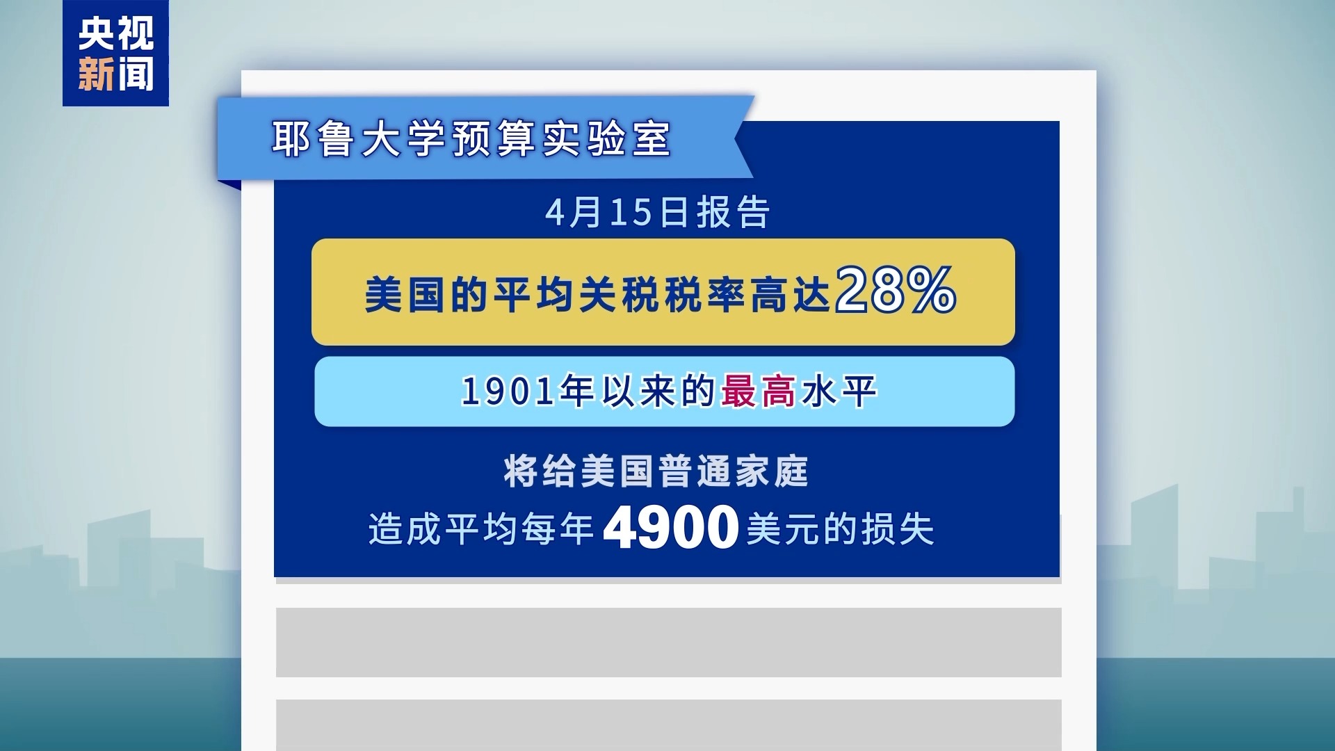4月15日,在美國(guó)與中國(guó)、英國(guó)達(dá)成協(xié)議前,耶魯大學(xué)預(yù)算實(shí)驗(yàn)室也曾發(fā)布過(guò)一份報(bào)告。這份報(bào)告稱,美國(guó)的平均關(guān)稅稅率當(dāng)時(shí)高達(dá)28%,為1901年以來(lái)的最高水平。按照當(dāng)時(shí)的關(guān)稅稅率,將給美國(guó)普通家庭造成平均每年4900美元的損失。
