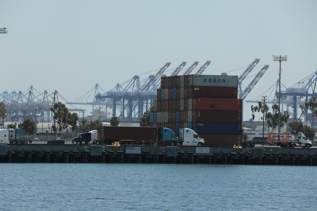 這是4月29日在美國洛杉磯港拍攝的集裝箱和卡車。洛杉磯港執(zhí)行董事吉恩·塞羅卡當天表示,隨著美國關(guān)稅政策導(dǎo)致企業(yè)削減進口訂單,洛杉磯港下周入境貨運量預(yù)計將比去年同期下跌超過35%。新華社發(fā)(邱晨攝)