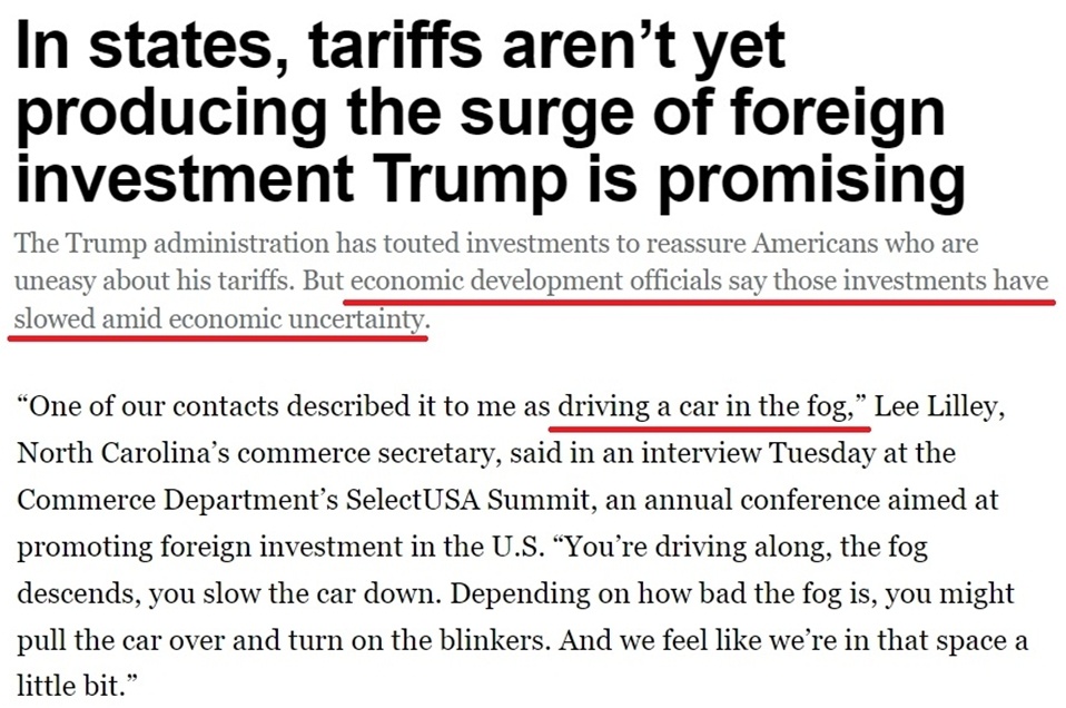 美國政府一直宣稱,加征關(guān)稅將為美國吸引數(shù)萬億美元的外國投資。但據(jù)美國《政治報》報道,來自美國多個州的政府官員和議員都抱怨說,白宮關(guān)稅政策引發(fā)的不確定性正在阻礙外資進入美國市場。