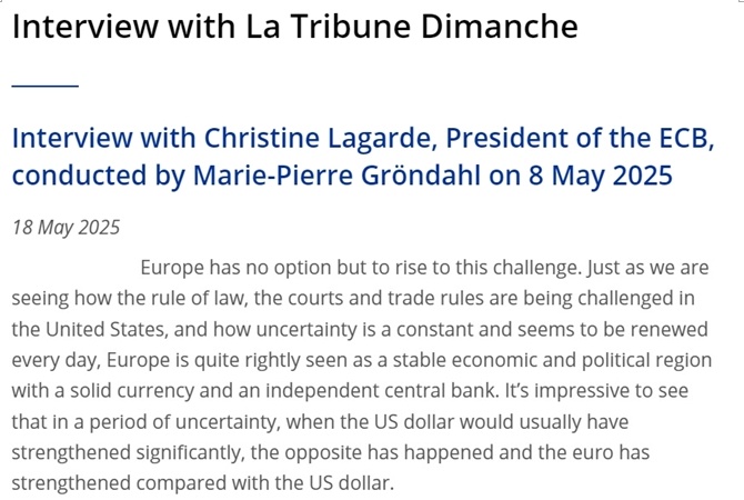 歐洲央行行長拉加德日前接受采訪時也表示,近期歐元對美元走強看似有悖直覺,其實源于金融市場對美國失去了信心。這是美國反復(fù)無常的關(guān)稅等政策造成的,“對歐洲來說是一個機遇”。