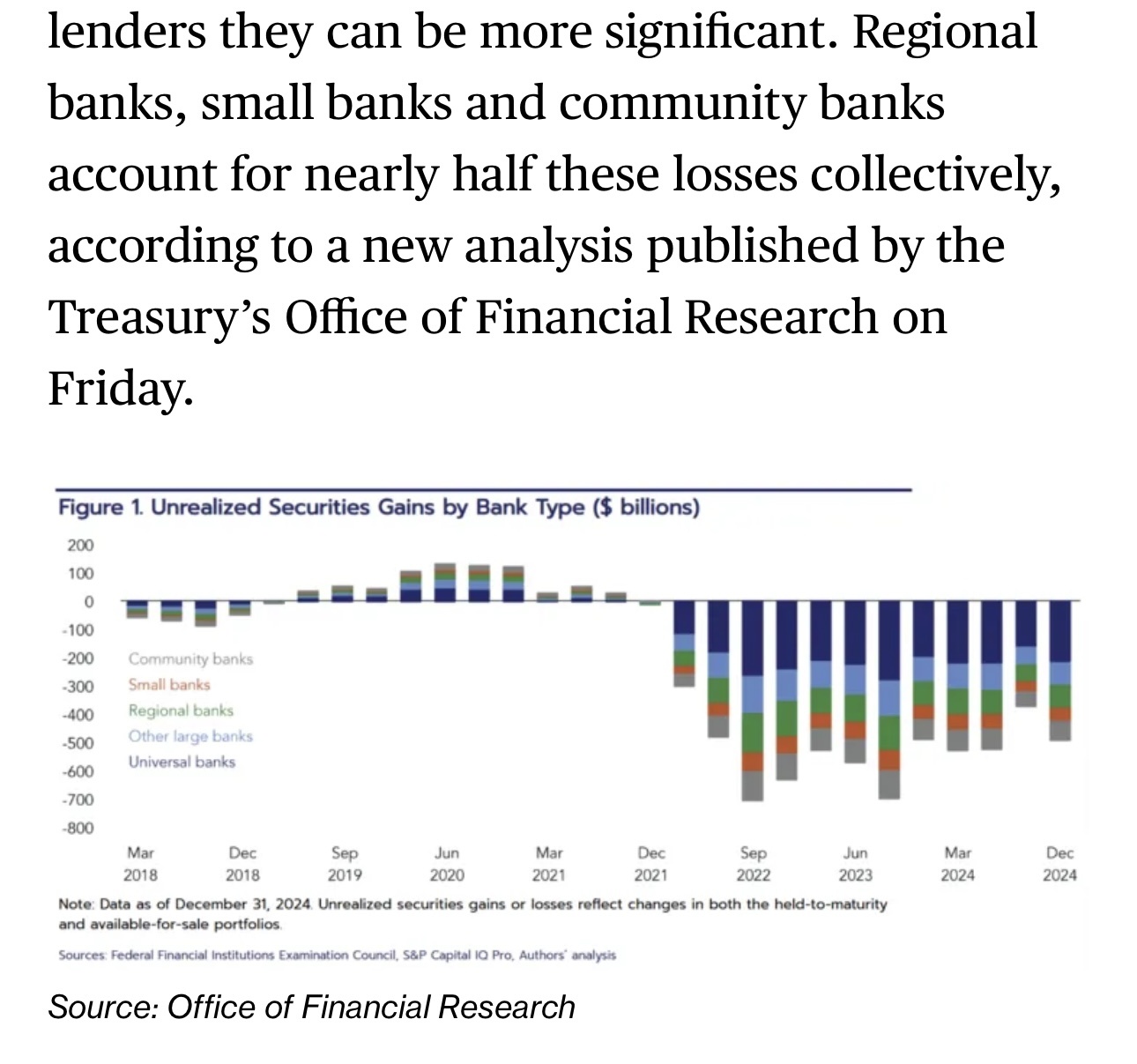 根據(jù)美國(guó)聯(lián)邦存款保險(xiǎn)公司的最新季度數(shù)據(jù),2024年第四季度,美國(guó)銀行債券持有的“未實(shí)現(xiàn)損失”總額進(jìn)一步擴(kuò)大,達(dá)到4820億美元,自9月底以來(lái)增加了1180億美元。而根據(jù)美國(guó)財(cái)政部金融研究辦公室此前發(fā)布的一份報(bào)告,地區(qū)性銀行、小型銀行和社區(qū)銀行共同承擔(dān)了這些損失的近一半。