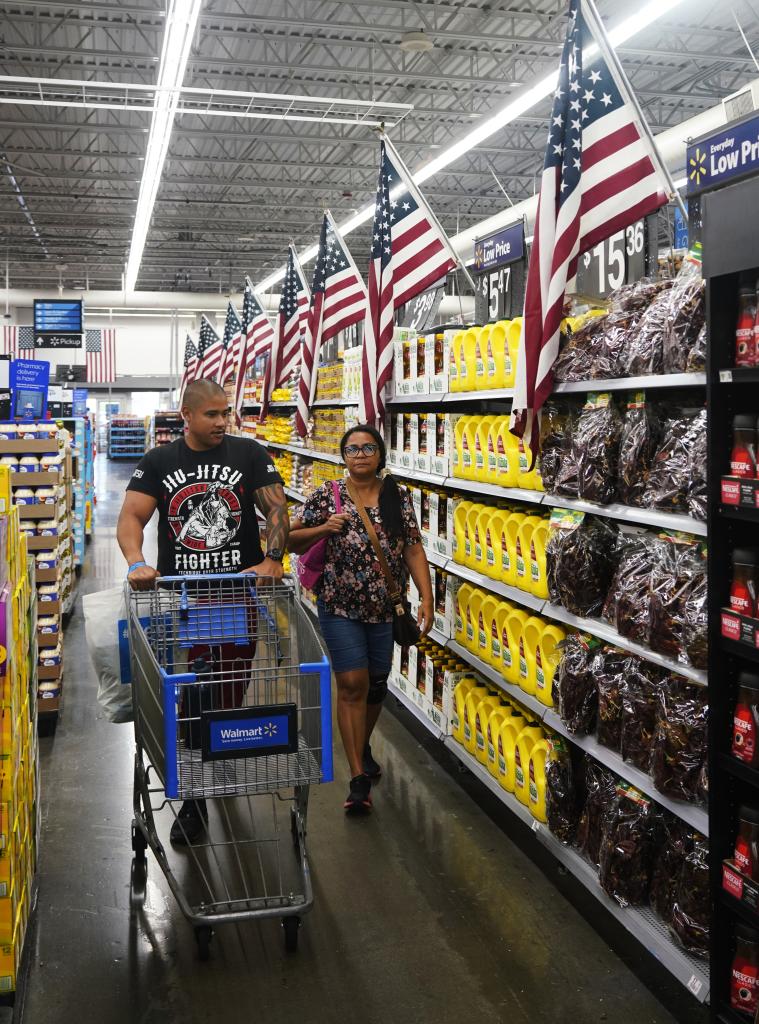5月21日,顧客在美國加利福尼亞州舊金山灣區(qū)圣萊安德羅的一家沃爾瑪超市購物。新華社記者 吳曉凌 攝