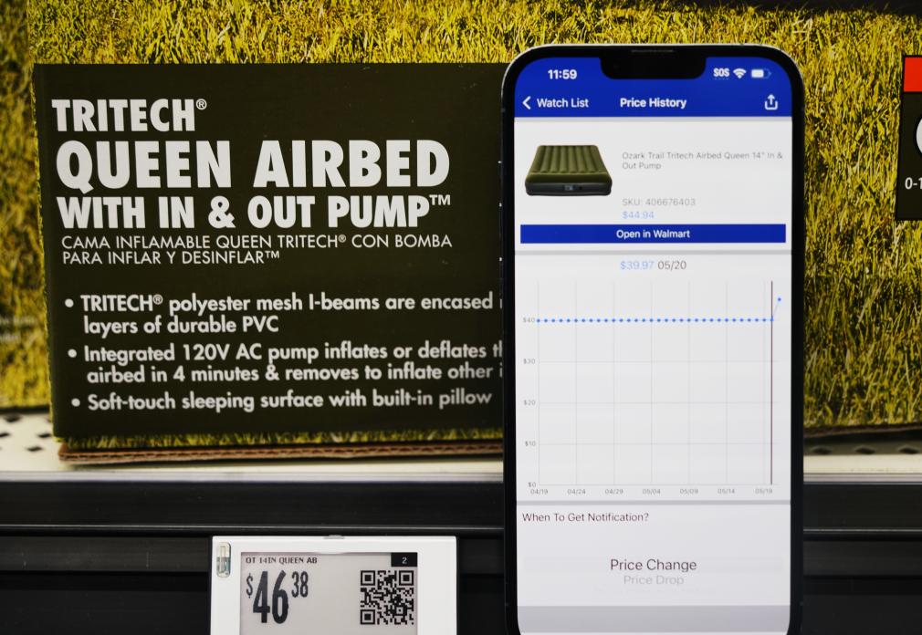 5月21日,在美國加利福尼亞州舊金山灣區(qū)圣萊安德羅的一家沃爾瑪超市,價格跟蹤軟件顯示一款中國產(chǎn)充氣床墊售價變化情況。新華社記者 吳曉凌 攝