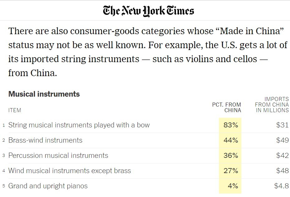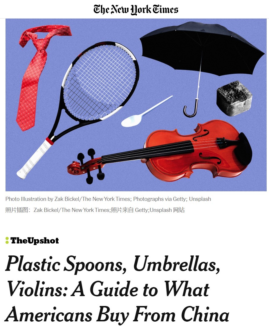 文章說(shuō),從清單中可以看出,美國(guó)從中國(guó)進(jìn)口的主要商品都是消費(fèi)品,覆蓋生活中的多個(gè)場(chǎng)景:你衣櫥中的領(lǐng)帶、手套和連褲襪幾乎都是從中國(guó)進(jìn)口的;如果你是一名運(yùn)動(dòng)員,尤其是球類(lèi)運(yùn)動(dòng)的運(yùn)動(dòng)員,那么你用的羽毛球、乒乓球、網(wǎng)球、健身房設(shè)備、泳池設(shè)備等都非常依賴(lài)“中國(guó)制造”;還有一些消費(fèi)品類(lèi)別的“中國(guó)制造”可能不那么廣為人知。例如,美國(guó)從中國(guó)進(jìn)口了大量弦樂(lè)器,包括小提琴和大提琴。維生素及其衍生物也大量從中國(guó)進(jìn)口,還有各種冷凍魚(yú)類(lèi),包括鰻魚(yú)、鱈魚(yú)、羅非魚(yú)等等。