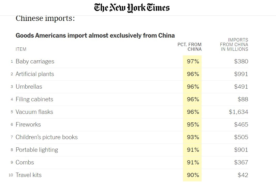 文章說(shuō),根據(jù)美國(guó)國(guó)際貿(mào)易委員會(huì)2024年發(fā)布的數(shù)據(jù),中國(guó)是美國(guó)多個(gè)商品品類(lèi)的唯一或主要進(jìn)口來(lái)源國(guó)。具體來(lái)看:幾乎完全從中國(guó)進(jìn)口的品類(lèi)包括嬰兒車(chē)、仿真植物、雨傘、煙花、兒童繪本等,進(jìn)口金額最高的品類(lèi)主要有電話、計(jì)算機(jī)、汽車(chē)及零部件、視頻顯示器、電熱器、玩具等;進(jìn)口數(shù)量最大的品類(lèi)主要是各類(lèi)塑料制品,包括塑料日用品和工業(yè)用塑料件等。