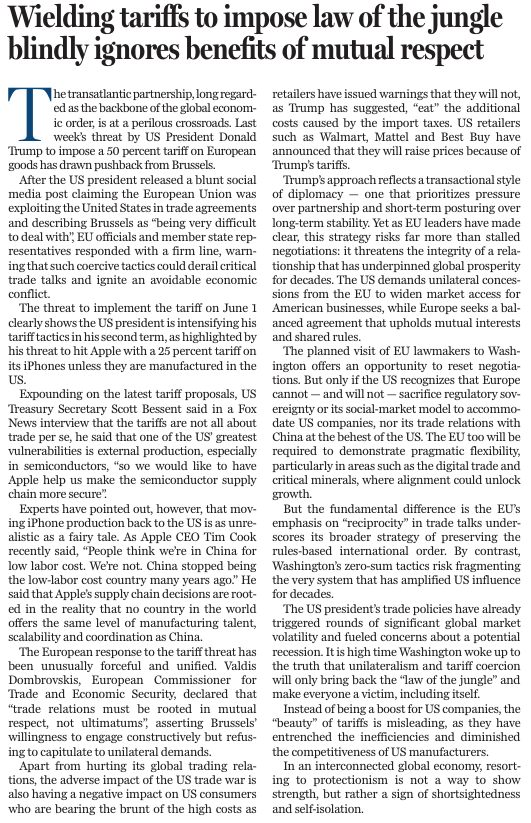 此次,歐盟對關(guān)稅威脅的回應(yīng)異常有力。歐盟貿(mào)易專員瓦爾迪斯·多姆布羅夫斯基斯明確表示:“貿(mào)易關(guān)系必須根植于相互尊重,而非強制與脅迫”。他同時強調(diào),歐委會愿意進行建設(shè)性接觸,但絕不向單邊措施屈服。