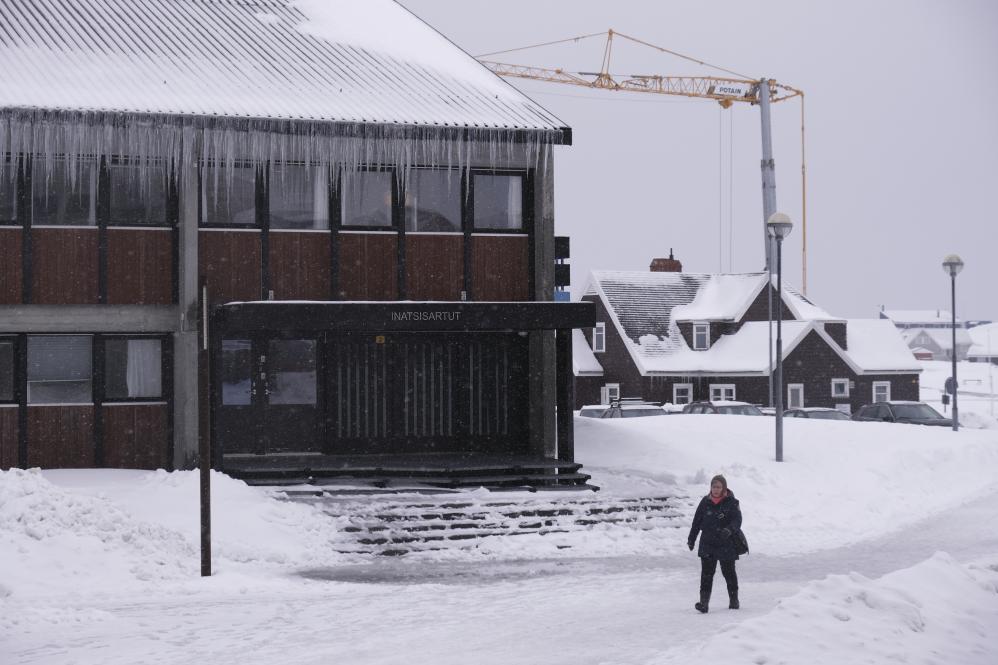 2025年3月24日,在丹麥自治領地格陵蘭島首府努克,一名行人經過格陵蘭島自治議會。新華社記者張玉亮攝