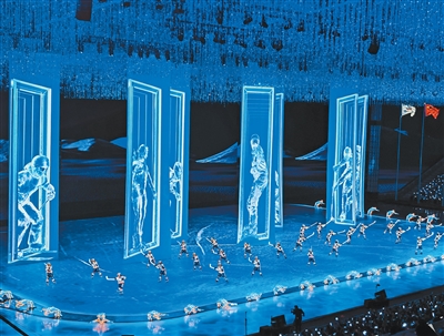 在哈爾濱第九屆亞洲冬季運動會開幕式上,巴可投影機(jī)呈現(xiàn)精彩的舞美效果。