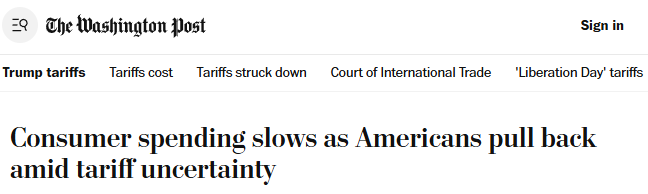 《華盛頓郵報》報道稱,由于美國政府的貿(mào)易戰(zhàn)持續(xù)引發(fā)經(jīng)濟(jì)不確定性,目睹關(guān)稅風(fēng)波的美國人已開始縮減開支。新數(shù)據(jù)顯示,美國人購買汽車和服裝時愈發(fā)謹(jǐn)慎。美國經(jīng)濟(jì)分析局5月30日發(fā)布的數(shù)據(jù)顯示,本就顯疲軟的消費(fèi)支出增長在4月顯著放緩,因為更多家庭在觀望關(guān)稅相關(guān)的不確定性將如何發(fā)展。