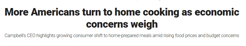 福克斯財經(jīng)(Fox Business)的報道援引了罐頭食品生產(chǎn)商金寶湯(Campbell's)首席執(zhí)行官米克·比克胡伊森的話稱,隨著經(jīng)濟(jì)擔(dān)憂加劇,更多美國家庭選擇在家烹飪以節(jié)省開支。他近期在其公司第三季度財報電話會議上告訴分析師,整個季度消費(fèi)者情緒持續(xù)疲軟,購物者在食品支出上變得更加謹(jǐn)慎。
