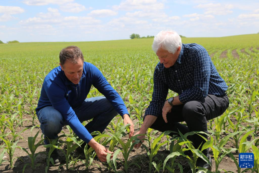 5月23日,在美國(guó)艾奧瓦州,艾奧瓦州大豆協(xié)會(huì)市場(chǎng)部高級(jí)主任格蘭特·金伯利(左)和他的父親瑞克·金伯利查看種植的玉米。新華社記者 劉亞南 攝