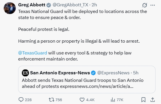 “和平抗議是合法行為,但傷害他人和損壞財產(chǎn)不合法,(肇事者)會被逮捕?!惫埠忘h籍的阿博特在社交媒體上說,“得州國民警衛(wèi)隊將用一切方式方法,幫助執(zhí)法機構(gòu)維持秩序?!?/p>