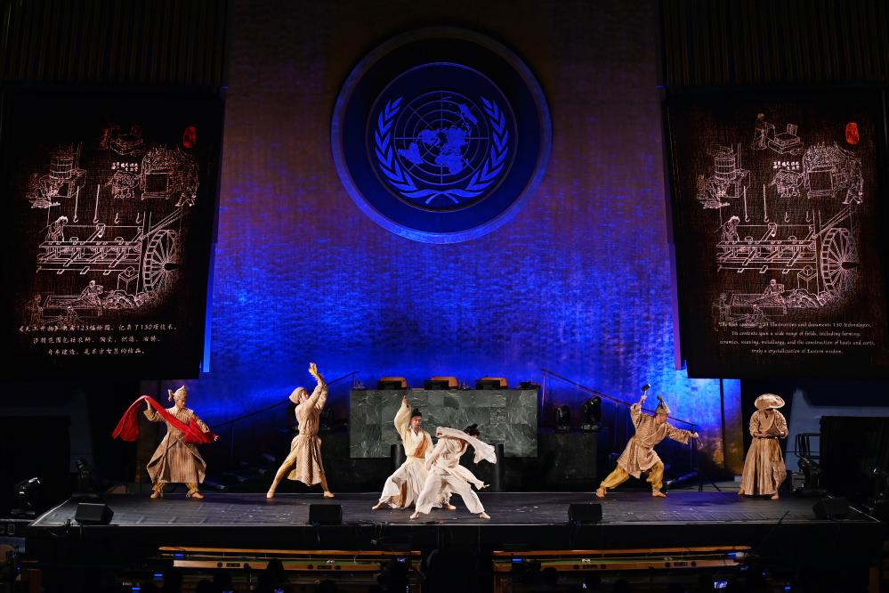 6月9日,在位于紐約的聯(lián)合國(guó)總部,演員在“跨越山海的文明對(duì)話”專(zhuān)場(chǎng)文藝演出上表演舞劇《天工開(kāi)物》選段。新華社記者 李睿 攝