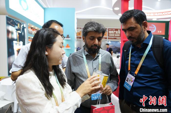 6月19日,來自巴基斯坦的客商在第9屆南博會(huì)咖啡產(chǎn)業(yè)館了解云南咖啡豆。中新社記者 劉冉陽 攝