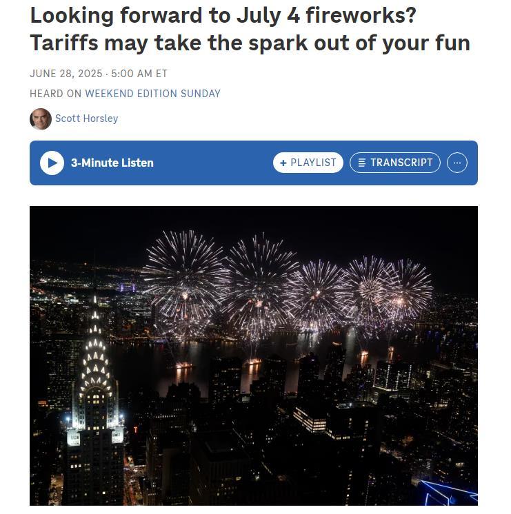 美國(guó)全國(guó)公共廣播電臺(tái)網(wǎng)站近日發(fā)表一篇文章說(shuō),美國(guó)人即將迎來(lái)獨(dú)立日慶典,燒烤派對(duì)、節(jié)日游行和煙花表演自然是重頭戲。但受特朗普政府加征關(guān)稅影響,今年煙花價(jià)格可能飆升,供應(yīng)也將更加緊俏。這是因?yàn)椋绹?guó)用于慶祝獨(dú)立日的火箭煙花、手持電光花和噴泉禮花,幾乎完全依賴(lài)中國(guó)供應(yīng)——而早在一千多年前,正是中國(guó)人發(fā)明了煙花。