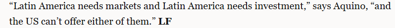 文章指出,并非所有人都對拉美與中國之間的合作感到滿意。華盛頓尤其擔(dān)心。不過,許多人認(rèn)為華盛頓影響拉丁美洲的能力有限。文章援引利馬國立圣馬科斯大學(xué)的亞洲經(jīng)濟(jì)專家卡洛斯·阿基諾的話指出,“拉丁美洲需要市場和投資,但美國無法提供其中任何一項”。