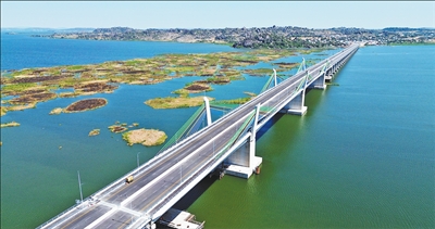 隨著坦桑尼亞總統(tǒng)哈桑揮動國旗,示意車輛可以通行,等待駛過馬古富力大橋的首批車輛紛紛啟動。身穿當(dāng)?shù)貍鹘y(tǒng)服飾的民眾載歌載舞,現(xiàn)場歡呼聲、歌聲、掌聲交織在一起……日前,由中國土木與中鐵十五局聯(lián)合承建的非洲最長矮塔斜拉橋——坦桑尼亞馬古富力大橋(見圖,中國土木供圖)建成通車。橫跨維多利亞湖的馬古富力大橋如一道飛虹連通兩岸,成為中非友誼新地標。