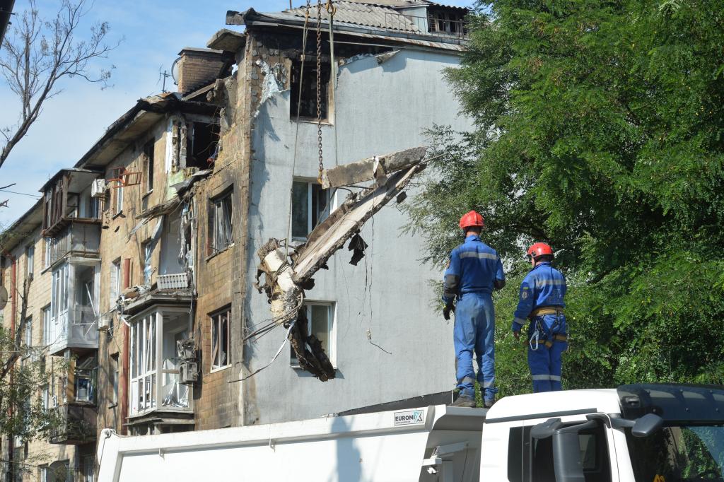 7月10日,在烏克蘭基輔市舍甫琴科夫斯基區(qū),救援人員拆除在空襲中受損的居民樓。新華社發(fā)(彼得·德魯克攝)