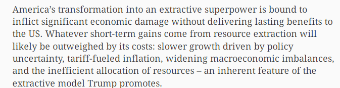 文章認(rèn)為,美國向資源掠奪型超級大國的蛻變,注定將無法為美國帶來持久利益,反而還會給美國自身造成重大經(jīng)濟(jì)損害。資源掠奪帶來的任何短期收益,都可能被以下代價(jià)抵消:政策不確定性導(dǎo)致的增長放緩、關(guān)稅推高的通貨膨脹、日益擴(kuò)大的宏觀經(jīng)濟(jì)失衡,以及資源配置的低效——這些正是掠奪模式與生俱來的缺陷。