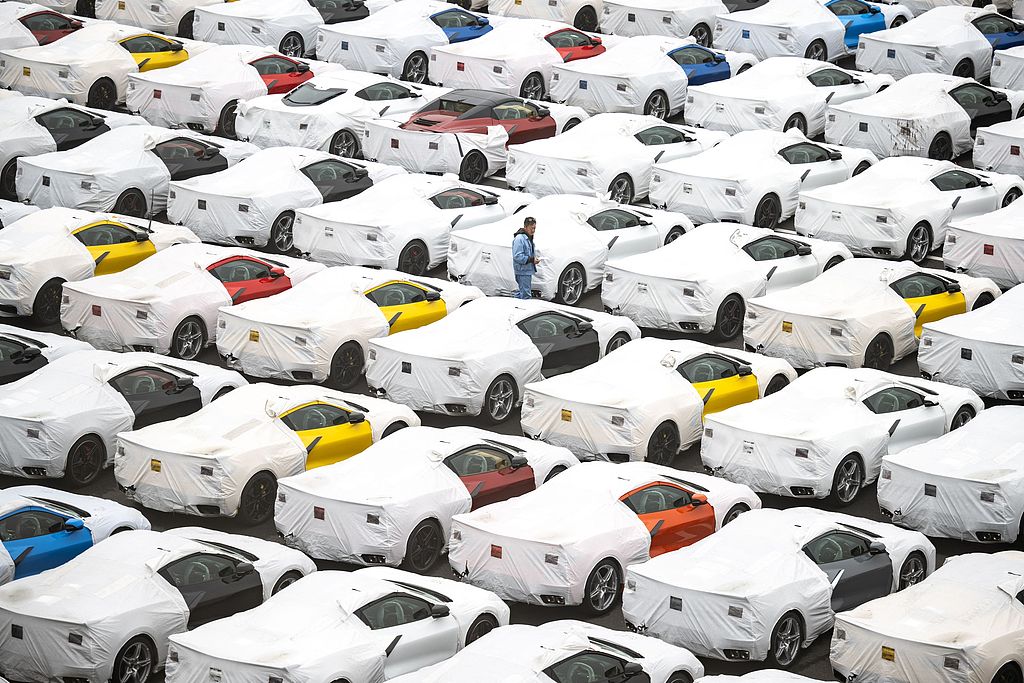 當地時間2025年4月11日,日本橫濱大黑碼頭,停放著新車。