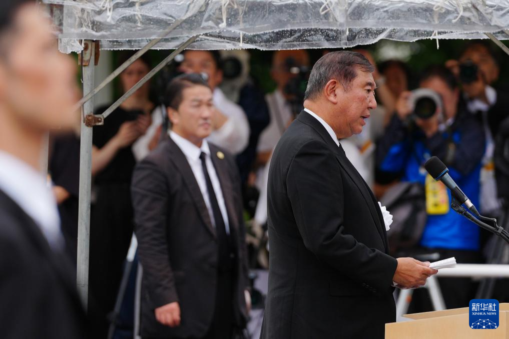 8月9日,日本首相石破茂在長崎舉行的遭原子彈轟炸紀(jì)念儀式上發(fā)言。新華社記者 賈浩成 攝
