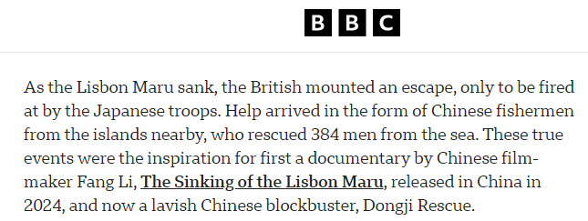 文章說,在這艘載有英軍戰(zhàn)俘的船只“里斯本丸”號(hào)沉沒過程中,英國戰(zhàn)俘組織突圍逃生,卻遭到日軍掃射。附近島嶼的中國漁民們伸出了援手,從海中救起384人。這一真實(shí)事件先后催生了兩部影視作品:紀(jì)錄片《里斯本丸沉沒》,以及電影《東極島》。
