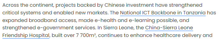 文章說,中國(guó)在非洲投資支持的項(xiàng)目夯實(shí)了關(guān)鍵系統(tǒng)根基,催生了新興市場(chǎng)。文章舉例說,坦桑尼亞的國(guó)家信息通信技術(shù)寬帶骨干網(wǎng)項(xiàng)目顯著拓寬了寬帶覆蓋范圍,讓線上醫(yī)療和線上學(xué)習(xí)成為可能,并強(qiáng)化了電子政務(wù)服務(wù)體系;塞拉利昂的中塞友好醫(yī)院持續(xù)提升當(dāng)?shù)氐尼t(yī)療服務(wù)水平,在抗擊埃博拉疫情期間發(fā)揮了關(guān)鍵作用……文章說,這些項(xiàng)目的故事或許不會(huì)成為西方媒體的頭條新聞,但它們實(shí)實(shí)在在提振了市場(chǎng),培養(yǎng)了勞動(dòng)技能,為非洲企業(yè)的蓬勃發(fā)展創(chuàng)造了條件。