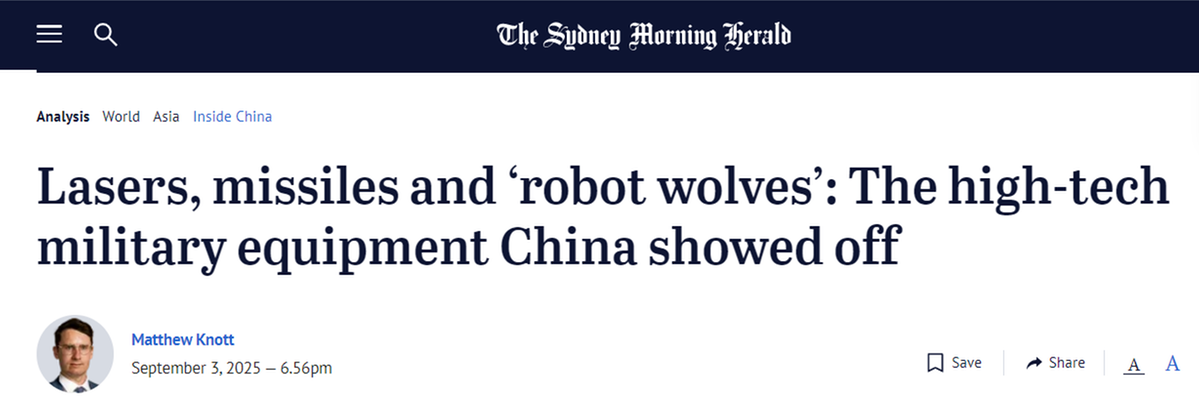 澳大利亞《悉尼先驅晨報》報道稱,中國閱兵式上展示了彈道導彈、激光武器、戰(zhàn)斗機、水下無人潛航器,甚至還有“機器狼”。