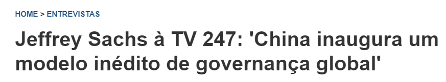 巴西247新聞網(wǎng)近日刊登一篇文章,介紹了世界知名學者杰弗里·薩克斯接受巴西247電視臺專訪時,對中國提出的全球治理倡議予以高度評價。他認為,“中國開創(chuàng)了前所未有的全球治理模式”。