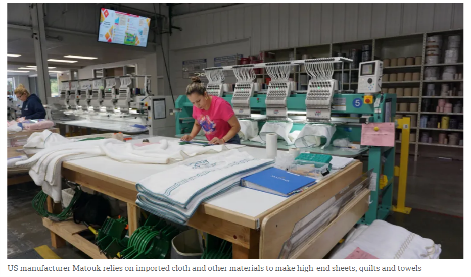 美國制造商喬治 馬圖克的床品工廠位于馬薩諸塞州福爾里弗市,依靠進(jìn)口布料和其他材料,這家工廠生產(chǎn)高端床單、被子和毛巾等產(chǎn)品。