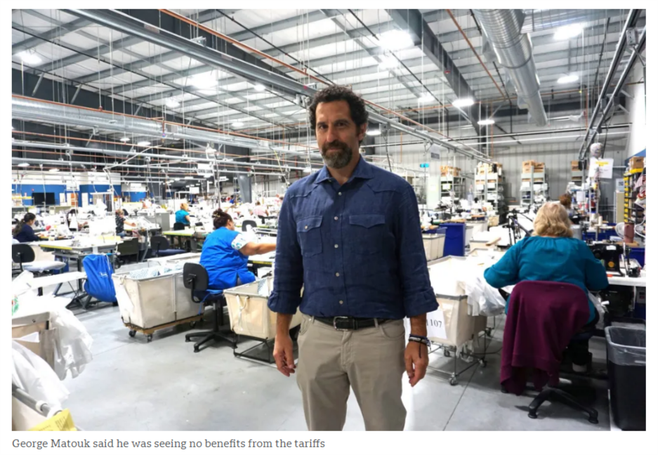 馬圖克表示,從今年4 月到 8 月,關(guān)稅導(dǎo)致其每月增加超過 10 萬美元的成本,因為高額關(guān)稅影響了來自印度和葡萄牙的棉布、來自列支敦士登的羽絨等原材料的供應(yīng)。不僅如此,增加的成本還迫使企業(yè)削減了在新設(shè)備以及營銷方面的開支。喬治 馬圖克說,他“沒有從關(guān)稅中看到任何好處”。