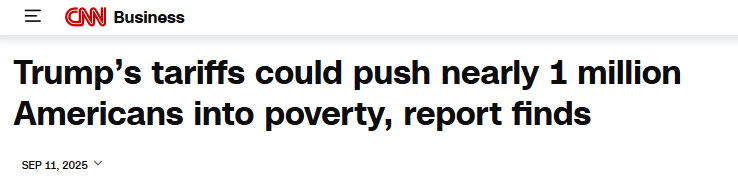 美國(guó)有線電視新聞網(wǎng)(CNN)11日?qǐng)?bào)道指出,特朗普政府的關(guān)稅政策在推高聯(lián)邦收入的同時(shí),恐導(dǎo)致顯著的社會(huì)成本。耶魯大學(xué)預(yù)算實(shí)驗(yàn)室最新分析顯示,這一系列政策或使近百萬(wàn)美國(guó)人陷入貧困。