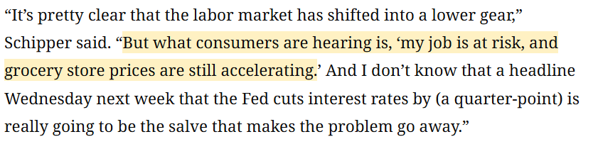 美國圣托馬斯大學(xué)副教授泰勒·施普爾 (Tyler Schipper)認(rèn)為 :對普通消費(fèi)者來說,耳邊最真切的聲音是“我的工作隨時可能保不住”,是“超市里的食品雜貨價格還在一個勁往上漲”。所以我實在不確定,下周“美聯(lián)儲降息”的頭條新聞,真能成為化解這些現(xiàn)實困境的良藥嗎?