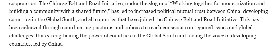 文章注意到,中國不僅提出與全球南方國家構(gòu)建人類命運共同體的新理念和新倡議,還宣布了與全球南方國家開展務(wù)實合作的新措施,涉及國家治理、工業(yè)化與農(nóng)業(yè)現(xiàn)代化、和平與安全,以及共建“一帶一路”框架下的高質(zhì)量合作等新議題,以實現(xiàn)互利共贏。