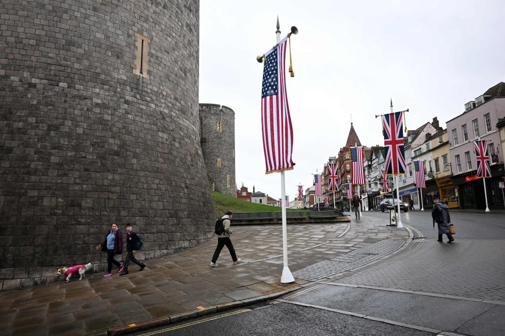 這是9月17日在英國倫敦近郊的溫莎城堡外拍攝的美國國旗和英國國旗。新華社/法新