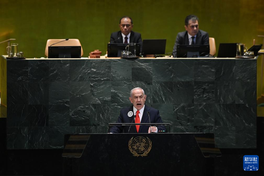 9月26日,在位于紐約的聯(lián)合國(guó)總部,以色列總理內(nèi)塔尼亞胡在第80屆聯(lián)合國(guó)大會(huì)一般性辯論發(fā)言。眾多聯(lián)合國(guó)會(huì)員國(guó)代表起身離席,退場(chǎng)抗議。新華社記者李睿攝