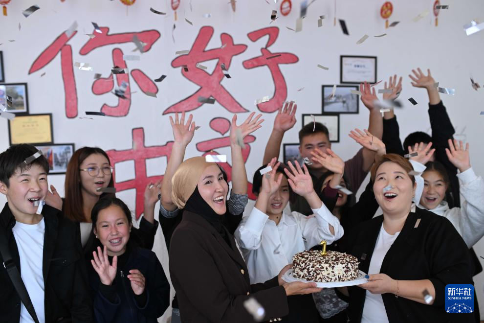 9月22日,在吉爾吉斯斯坦伊塞克湖州卡拉庫(kù)爾市,庫(kù)巴內(nèi)奇別科娃(前右)和同事、學(xué)生們共同慶祝中文培訓(xùn)中心成立一周年。新華社記者 李任滋 攝