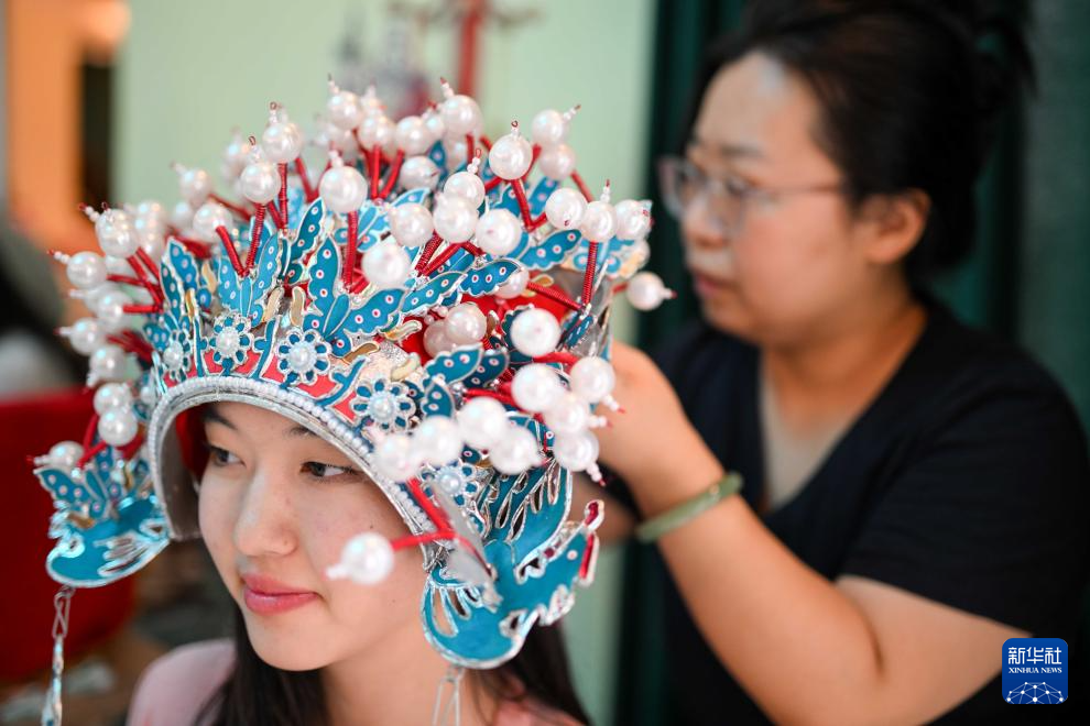 9月18日,在吉爾吉斯斯坦奧什國(guó)立大學(xué)孔子學(xué)院,一名教師為學(xué)生佩戴晚會(huì)活動(dòng)上用的頭冠。新華社記者 李任滋 攝