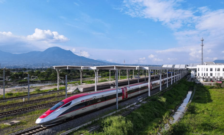 5月20日,在印度尼西亞萬隆,一列雅萬高鐵高速動車組列車駛出德卡魯爾站(無人機照片)。新華社記者 徐欽 攝
