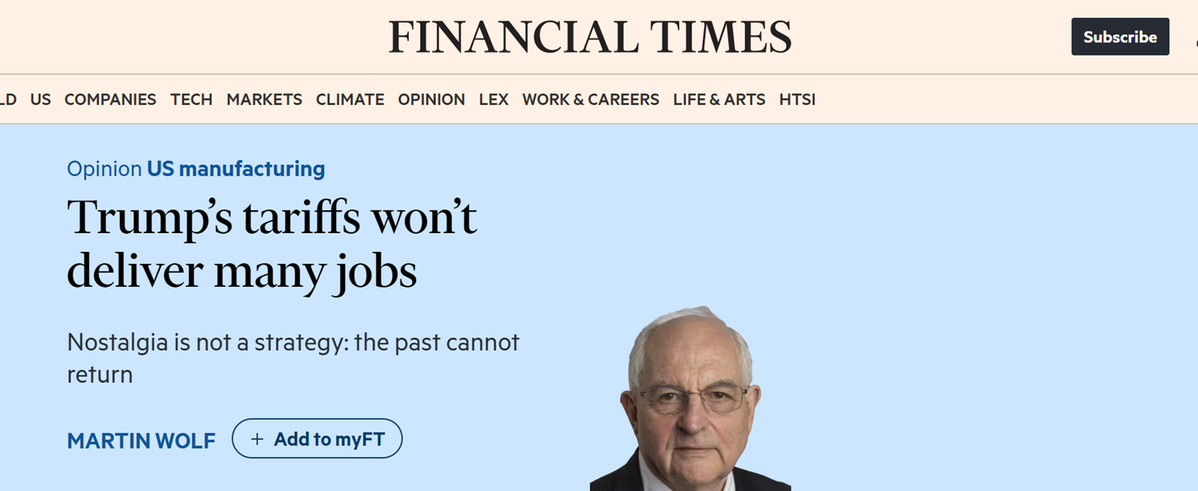 英國(guó)《金融時(shí)報(bào)》副總編及首席經(jīng)濟(jì)評(píng)論員馬丁·沃爾夫(Martin Wolf)8日發(fā)表評(píng)論文章稱(chēng),事實(shí)表明,特朗普政府推行的貿(mào)易保護(hù)主義政策,并未兌現(xiàn)其對(duì)選民所作的核心承諾——為美國(guó)創(chuàng)造大量制造業(yè)就業(yè)崗位,尤其是面向那些曾經(jīng)依賴傳統(tǒng)工業(yè)、如今卻面臨地區(qū)經(jīng)濟(jì)衰落困境的工人群體。他進(jìn)一步指出,這一承諾本質(zhì)上是空洞的,其政策實(shí)質(zhì)是為政府自身及其背后的富豪階層牟取利益。