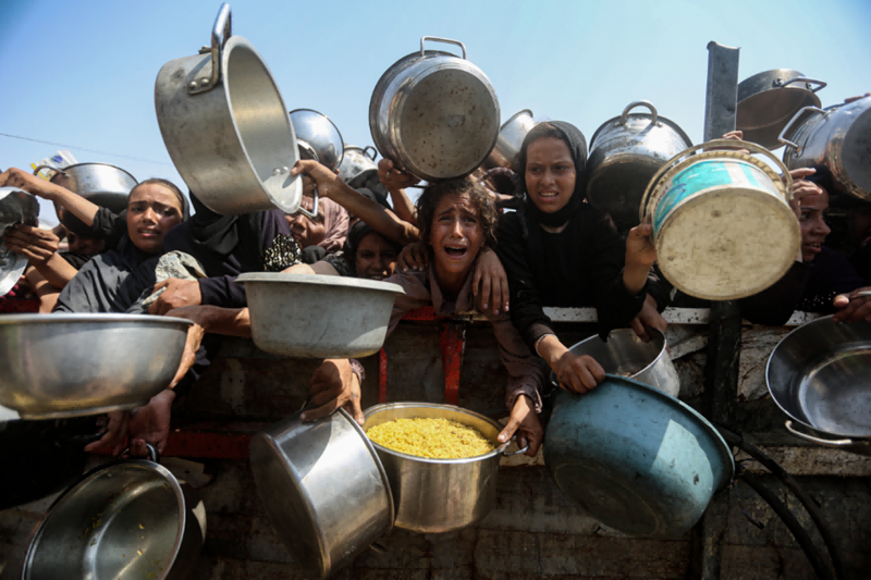 2025年8月10日,民眾在加沙城領(lǐng)取免費(fèi)食物。新華社發(fā)(里澤克·阿卜杜勒賈瓦德攝)