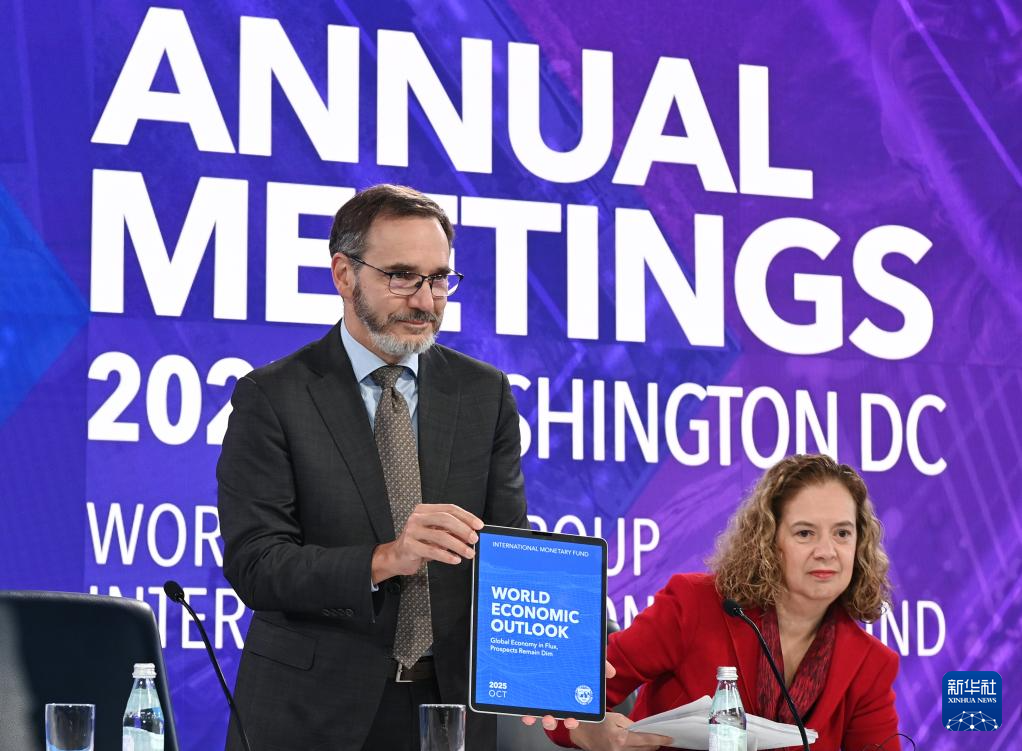 10月14日,在美國(guó)華盛頓,國(guó)際貨幣基金組織首席經(jīng)濟(jì)學(xué)家皮埃爾-奧利維耶·古蘭沙(左)在《世界經(jīng)濟(jì)展望報(bào)告》新聞發(fā)布會(huì)上展示報(bào)告。新華社記者 李睿 攝