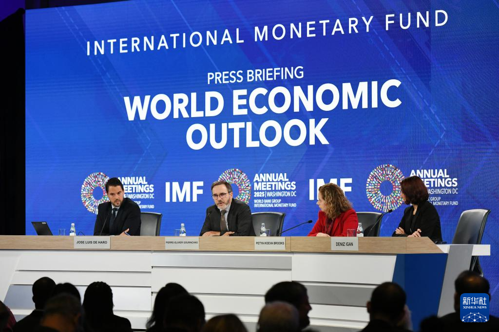 10月14日,在美國(guó)華盛頓,國(guó)際貨幣基金組織首席經(jīng)濟(jì)學(xué)家皮埃爾-奧利維耶·古蘭沙(中)在《世界經(jīng)濟(jì)展望報(bào)告》新聞發(fā)布會(huì)上講話。新華社記者 李睿 攝