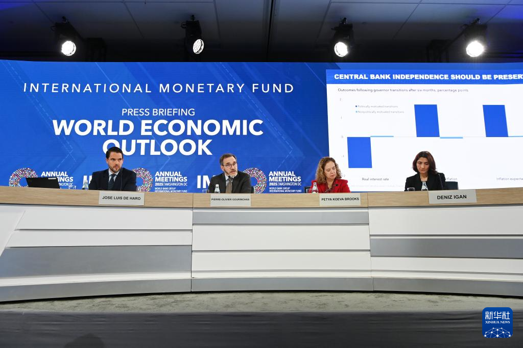 10月14日,在美國(guó)華盛頓,國(guó)際貨幣基金組織首席經(jīng)濟(jì)學(xué)家皮埃爾-奧利維耶·古蘭沙(左二)在《世界經(jīng)濟(jì)展望報(bào)告》新聞發(fā)布會(huì)上講話。新華社記者 李睿 攝